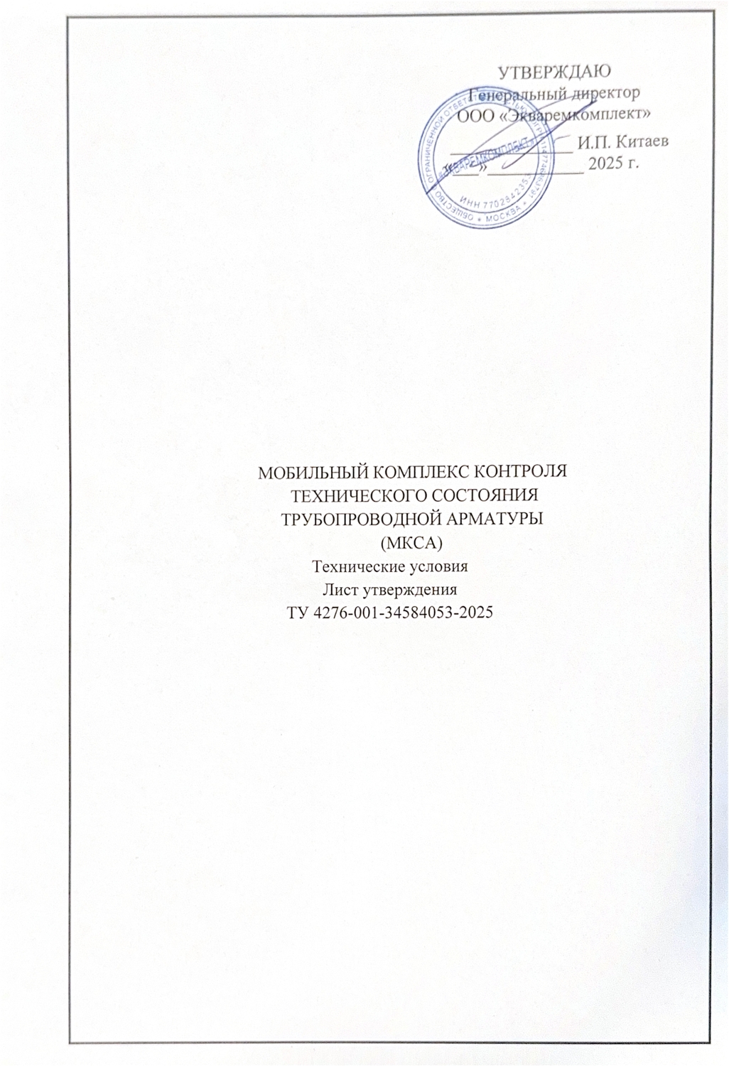 технические Условия ТУ 4276-001-34584053-2025 МОБИЛЬНЫЙ КОМПЛЕКС КОНТРОЛЯ ТЕХНИЧЕСКОГО СОСТОЯНИЯ ТРУБОПРОВОДНОЙ АРМАТУРЫ (МКСА) ООО «Экваремкомплект» зарегистрированно